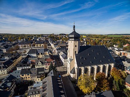 Ergänzend zu dem kurzen Blick in die Kirche im Rahmen einer Stadtführung empfehlen wir Ihnen eine fachkundige Führung durch die Kirche St. Marien. Sie ist die jüngste der spätgotischen Hallenkirchen im Erzgebirge und wurde von 1558 – 1564 erbaut. Zu sehen ist eine interessante Verbindung von gotischen Kreuzrippengewölben im Vorraum sowie den beiden Seitenkapellen und einem Hauptraum in reinstem Renaissance-Stil. Werfen Sie zudem einen Blick auf die „Schätze“ der Kirche: den Renaissance-Altar mit einem Bild von Kilian Fabritius, den Anna-Selbdritt-Altar aus der Zeit der Stadtgründung, den Lengefelder Altar, die Orgel von Carl-Eduard Schubert mit 3158 Pfeifen, die „freie Rippe“, Epitaphien und viele weitere Besonderheiten.
