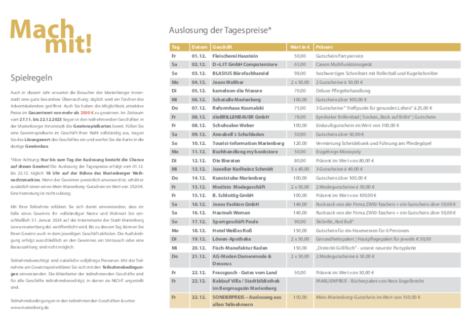 Im Zeitraum vom 27.11.2023 bis 22.12.2023 liegen in den teilnehmenden Geschäften in der Marienberger Innenstadt die Gewinnspielkarten bereit. Die mit dem Lösungswort des Tagesrätsels und der Adresse der Teilnehmer ausgefüllten Karten werden in die Gewinnbox im Geschäft eingeworfen.