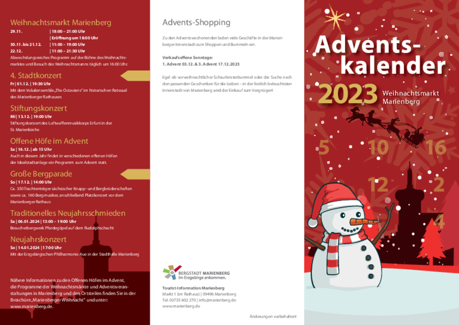 Freuen Sie sich auf viele Überraschungen in der Vorweihnachtszeit – zum Genießen, Verwöhnen oder Verschenken! Informationen zum Adventskalender, zu den teilnehmenden Geschäften und den attraktiven Preisen sind zu finden unter www.marienberg.de.