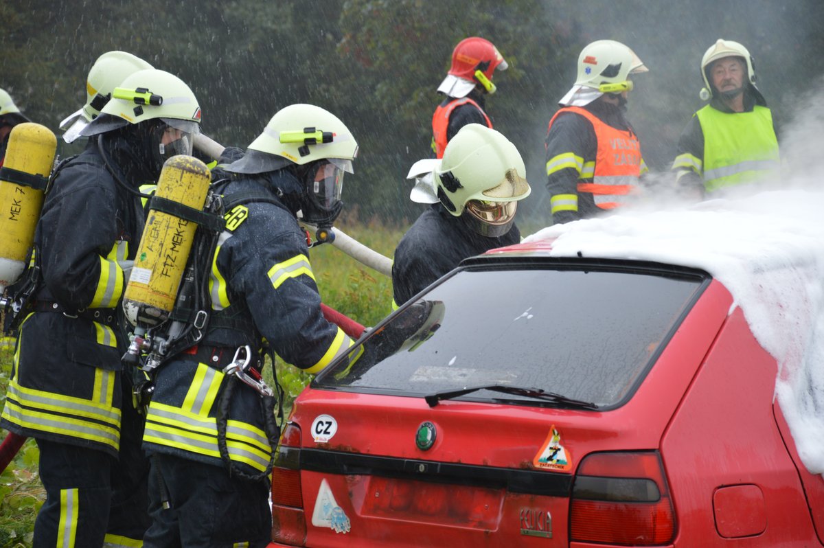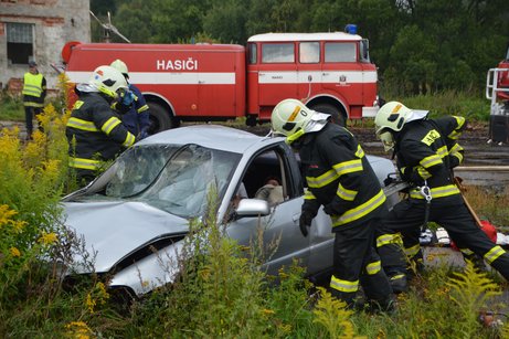 Die erste Übungsaufgabe lautete: „Unfallrettung von drei eingeklemmten Personen aus zwei Fahrzeugen“ und wurde durch die Freiwilligen Feuerwehren Hora Svatého Šebestiána und Satzung gemeinsam bewältigt.