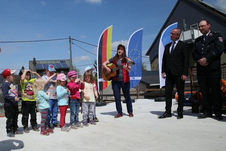 Für die gute Verständigung mit den tschechischen Gästen sorgte Dolmetscherin, Frau Polesná aus Ústí nad Labem. Die Kinder vom ortsansässigen Kindergarten „Senfkorn“ umrahmten mit einem sehr passenden Programm den feierlichen Akt der Grundsteinlegung. Sie hatten ganz genau im Blick, was sich nun seit