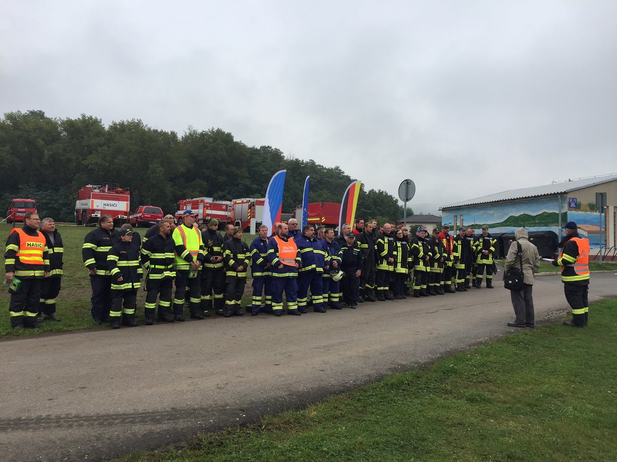 Insgesamt 53 Kameraden der beteiligten Freiwilligen Feuerwehren trafen sich 11:00 Uhr bei strömendem Regen mit ihrer auf insgesamt 10 Fahrzeugen verlasteten Rettungstechnik am Gerätehaus der Freiwilligen Feuerwehr Hora Svatého Šebestiána.