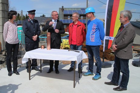 Nach seiner Rede übergab der Oberbürgermeister das Wort an den Projektplaner Joachim Baldauf, der einige Ausführungen zur Art und Weise des Gebäudes machte. Wehrleiter Michael Rothe schaute dankbar auf die erste Etappe beim Bau des neuen Gerätehauses, bedankte sich für die bisherige Unterstützung bei Stadtrat und Verwaltung, den befreundeten Feuerwehrkameraden aus Tschechien und der Förderstelle. An der Vorfreude auf den Umzug und die zu erwartenden guten Bedingungen, ließ er alle Gäste teilhaben. Die Vorbereitung für die Grundsteinlegung mit dem Bestücken der Hülse mit Zeitdokumenten tätigten der Oberbürgermeister André Heinrich, die Beigeordnete für das Finanzwesen, Heike Dachselt, der Planer Joachim Baldauf, der Wehrleiter Michael Rothe, Stadtrat und ehrenamtlicher Stellvertreter des Oberbürgermeistes, Uwe Theml sowie der Geschäftsführer der bauausführenden Firma, Jens Heidel. Das Versenken der Hülse und das Verschließen mit Beton übernahm der Polier Peter Wenzel, bevor die symbolischen Hammerschläge gesetzt wurden. Pfarrer Volkmar Freier betonte in seinen Worten, wie wichtig die Feuerwehr für das Gemeinwesen ist und sprach den Segen für einen guten Bauverlauf aus. Mit kleinen Geschenken dankte der Oberbürgermeister den Kindern. Die Gäste lud er in das alte Feuerwehrgerätehaus ein, wo sich in freundschaftlicher Atmosphäre ein reger Austausch anschloss.